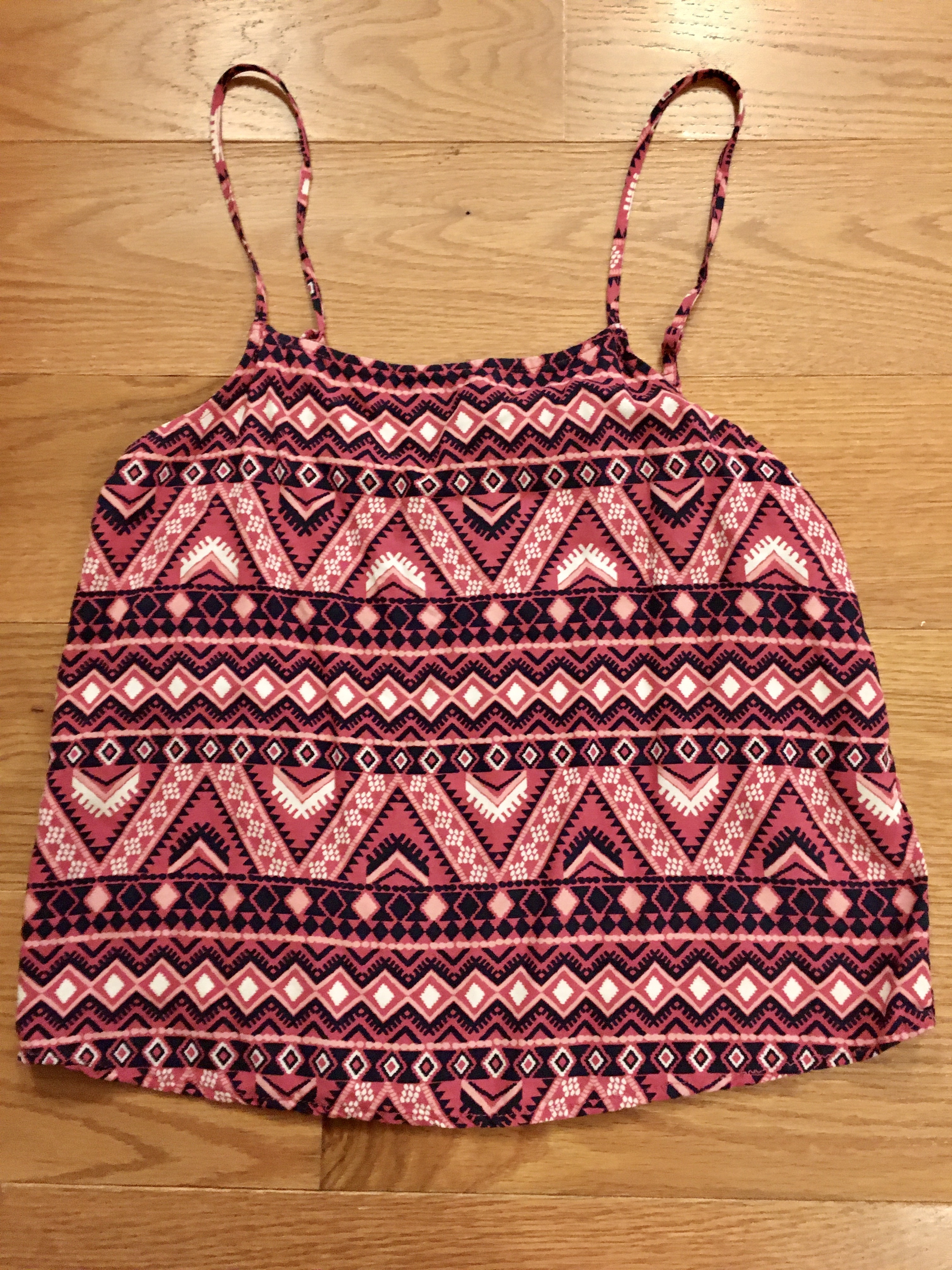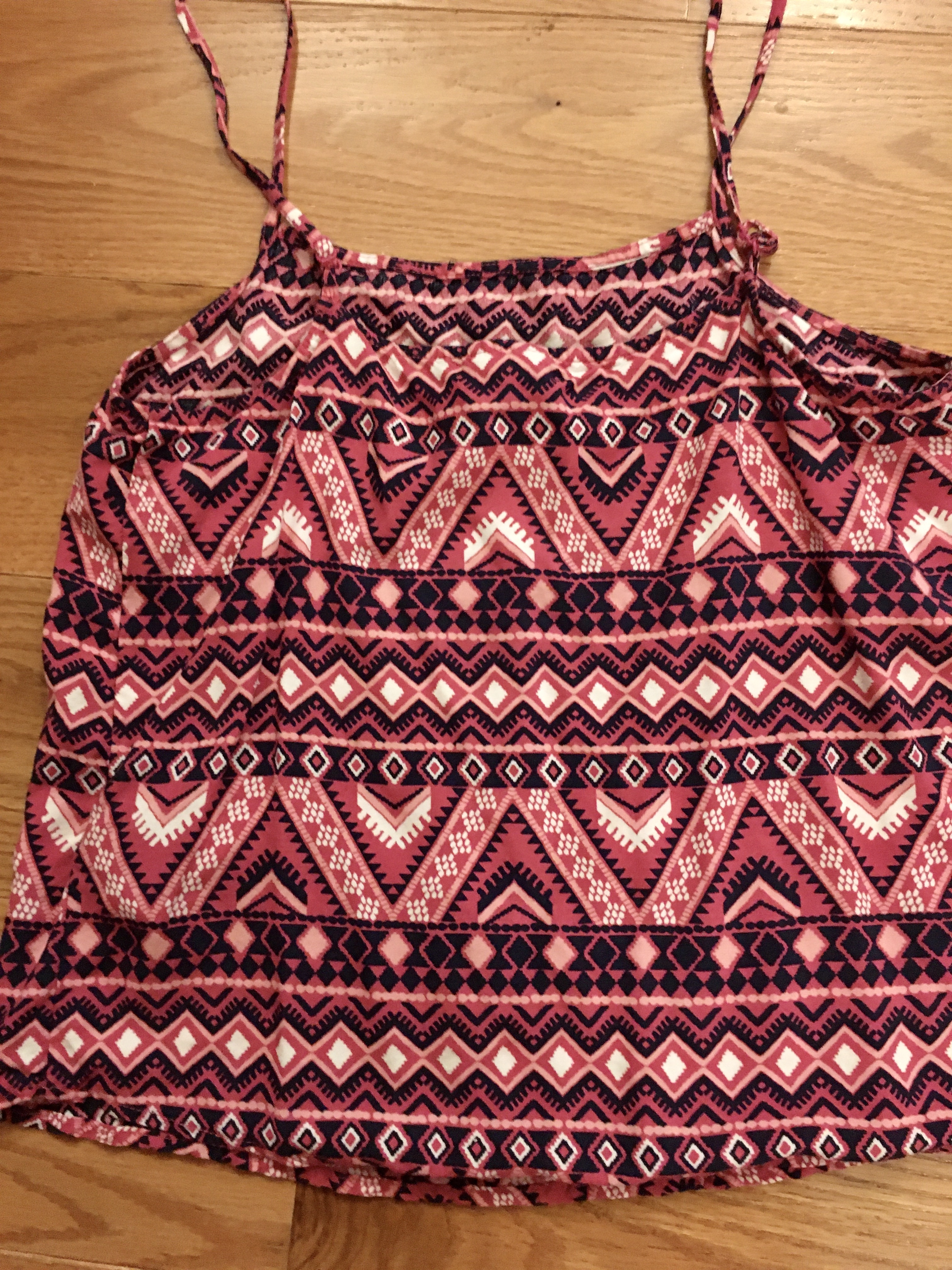 This is labeled as small but might be more of a medium? For me, the straps were too long and kept falling off my shoulder, which is an automatic nip slip with a shirt this flowy. I’m also an A cup so somebody w/ a bigger chest to fill out the top might not have the same problem. This is a stretchy material. Brand is C? Yeah, just the letter C. Idk.