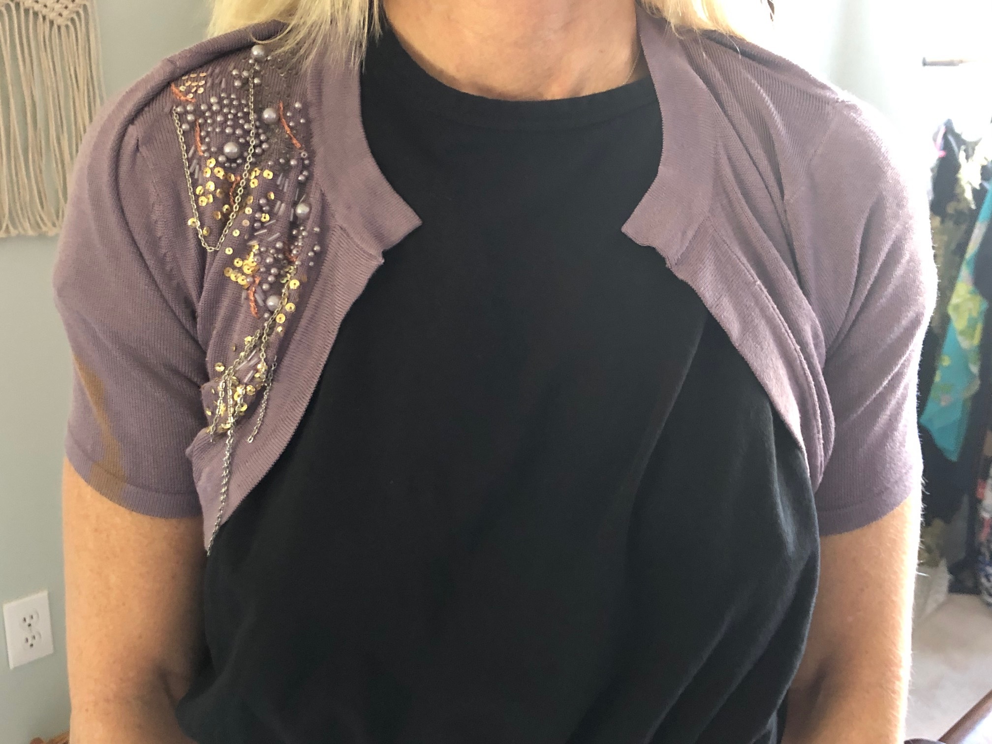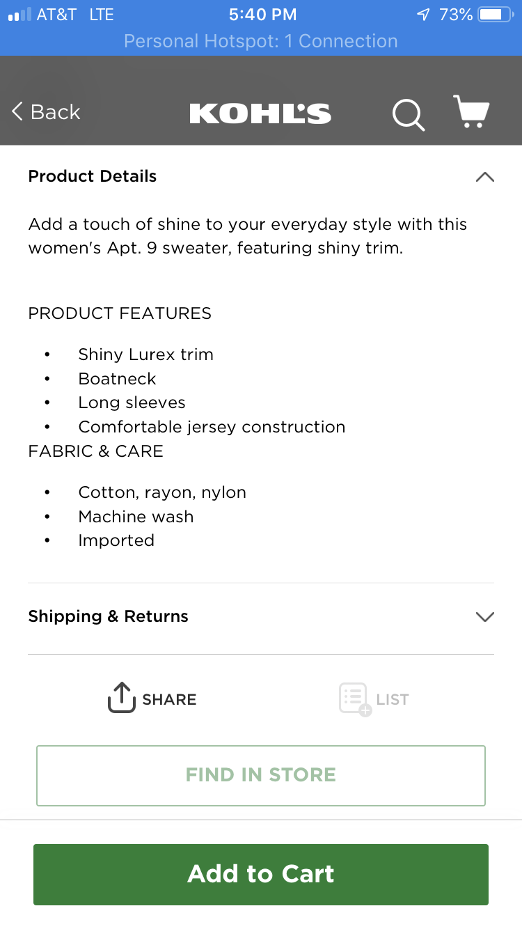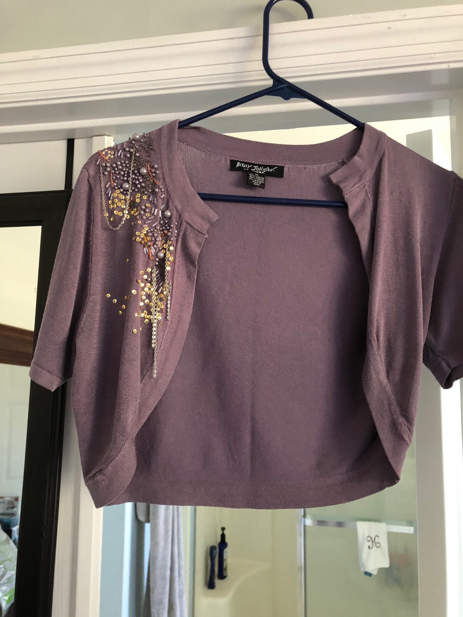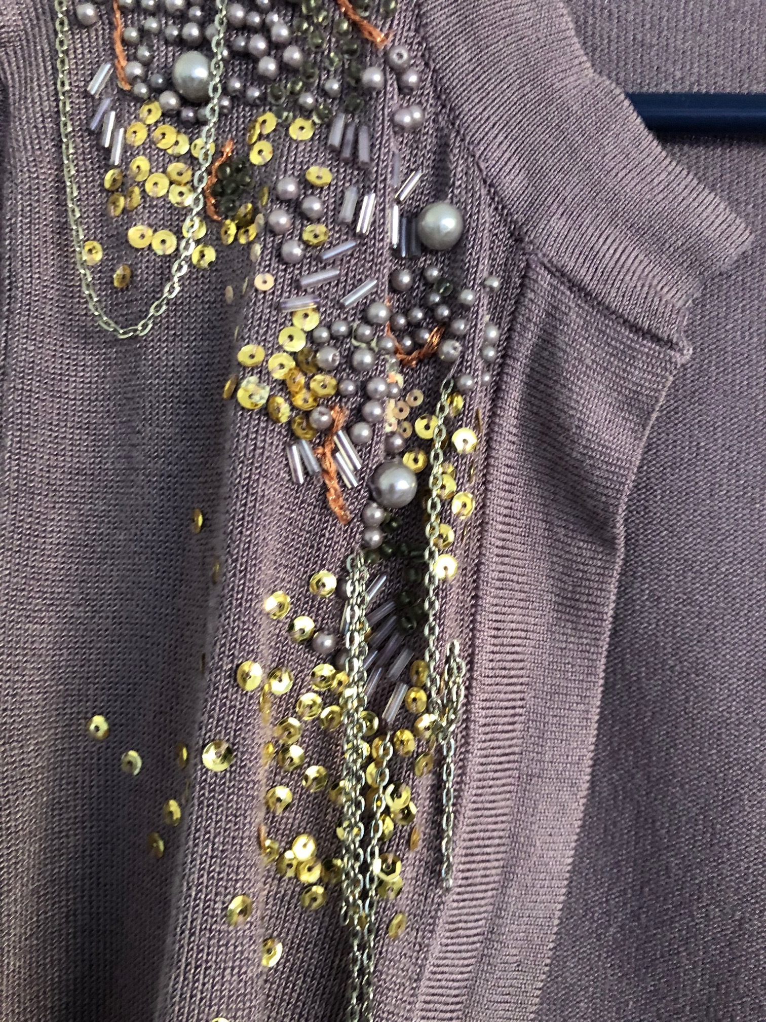 Apt. 9 boatneck sweater. In Stone Heather (which is kind of an off white or oatmeal color). Brownish gold lurex trim on seams. Brand new. I took off the tags but never wore it. It’s a size small but could fit a medium too.