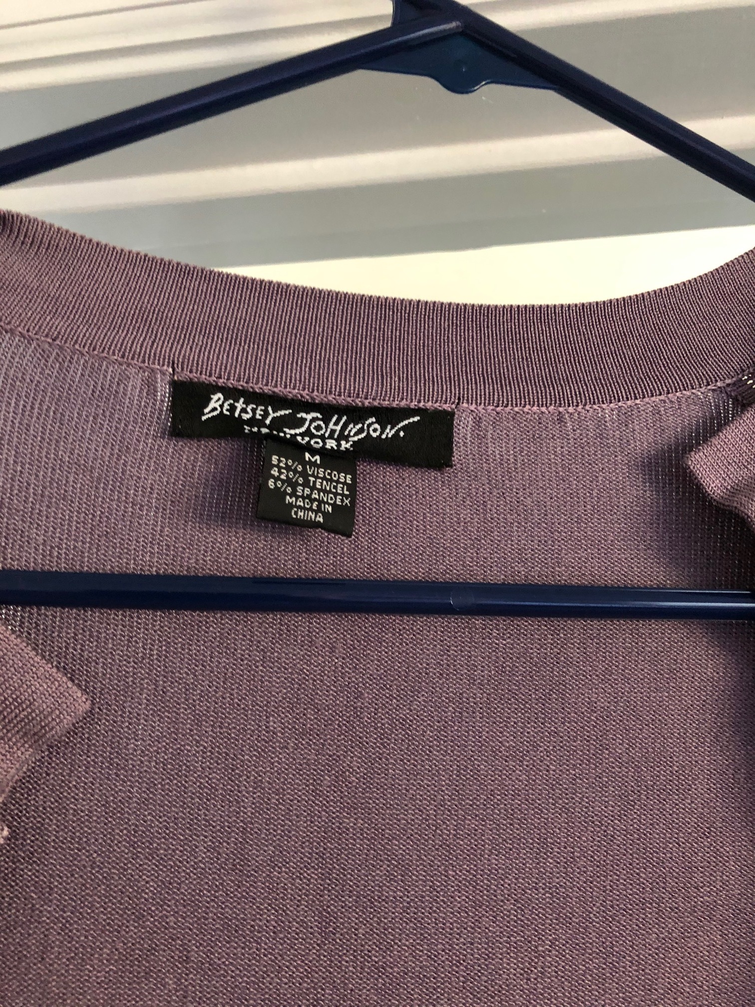 Beautiful, soft sweater jacket and shell. Drapes really nicely, and the trim on the jacket is sharp. The color is a burnt orange (looks different from the picture). I never wore this - bought right before I retired and also, I bought it a bit small thinking I'd be losing weight and fitting into it (and I didn't!)