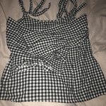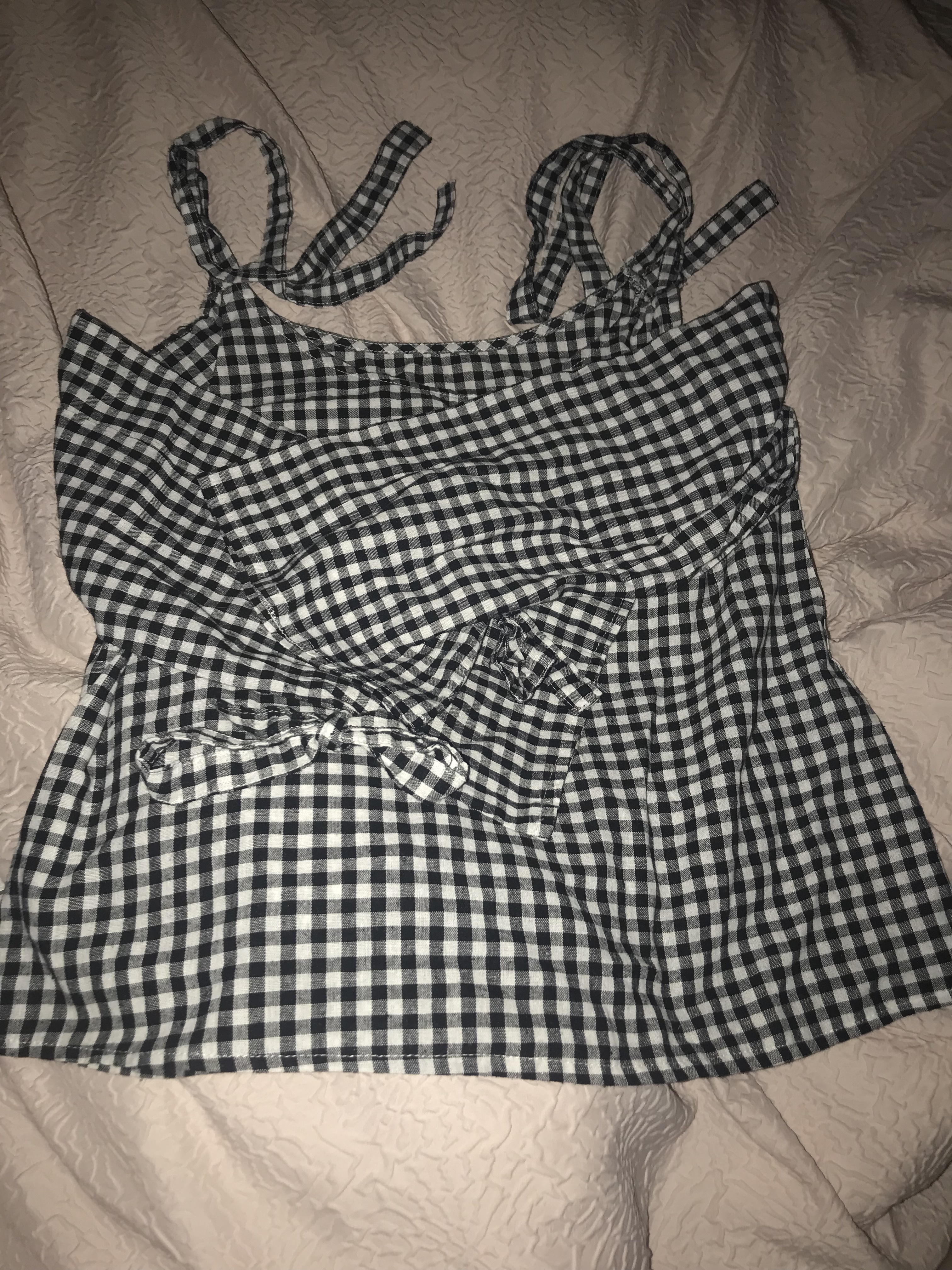 Black and white gingham print shirt. Three-quarter sleeves with ties, and off the shoulder straps with ties.