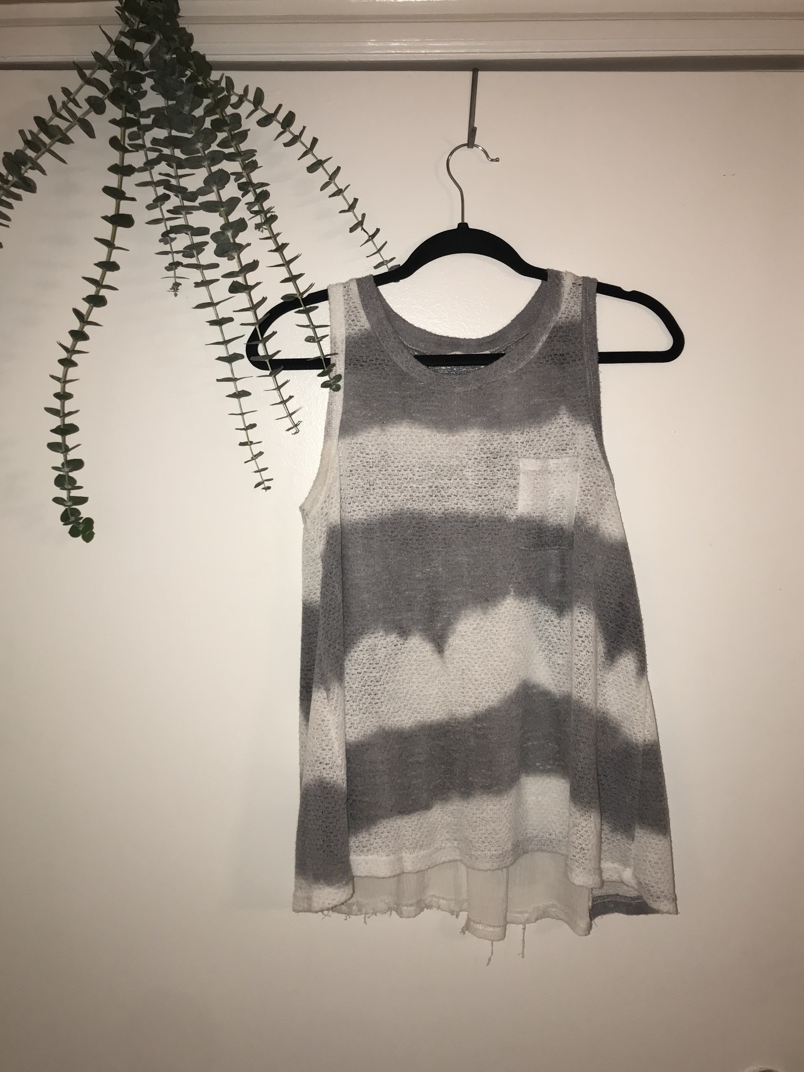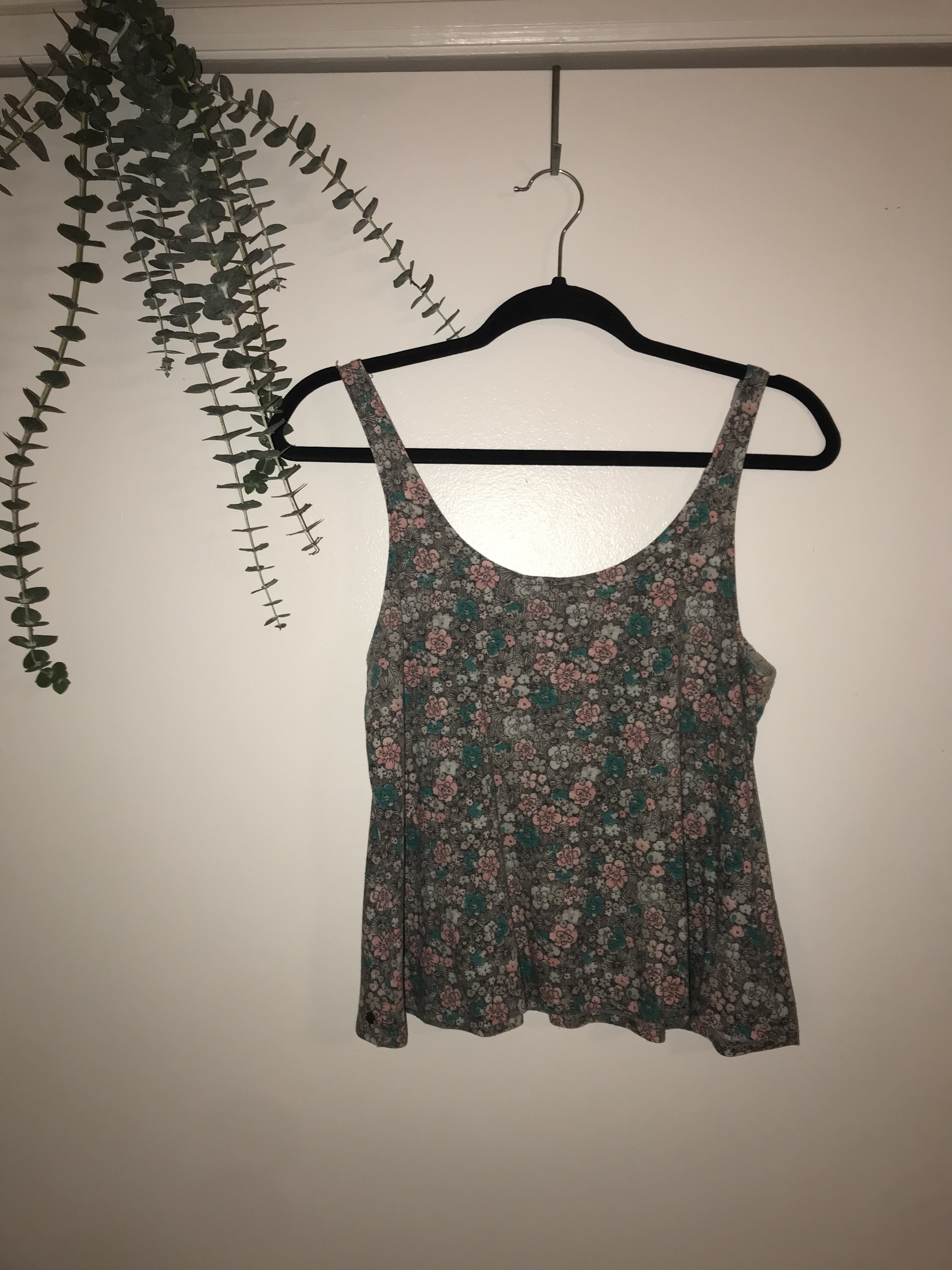 Cute tank top with three snap buttons.Worn but still great. No rips and no stains.