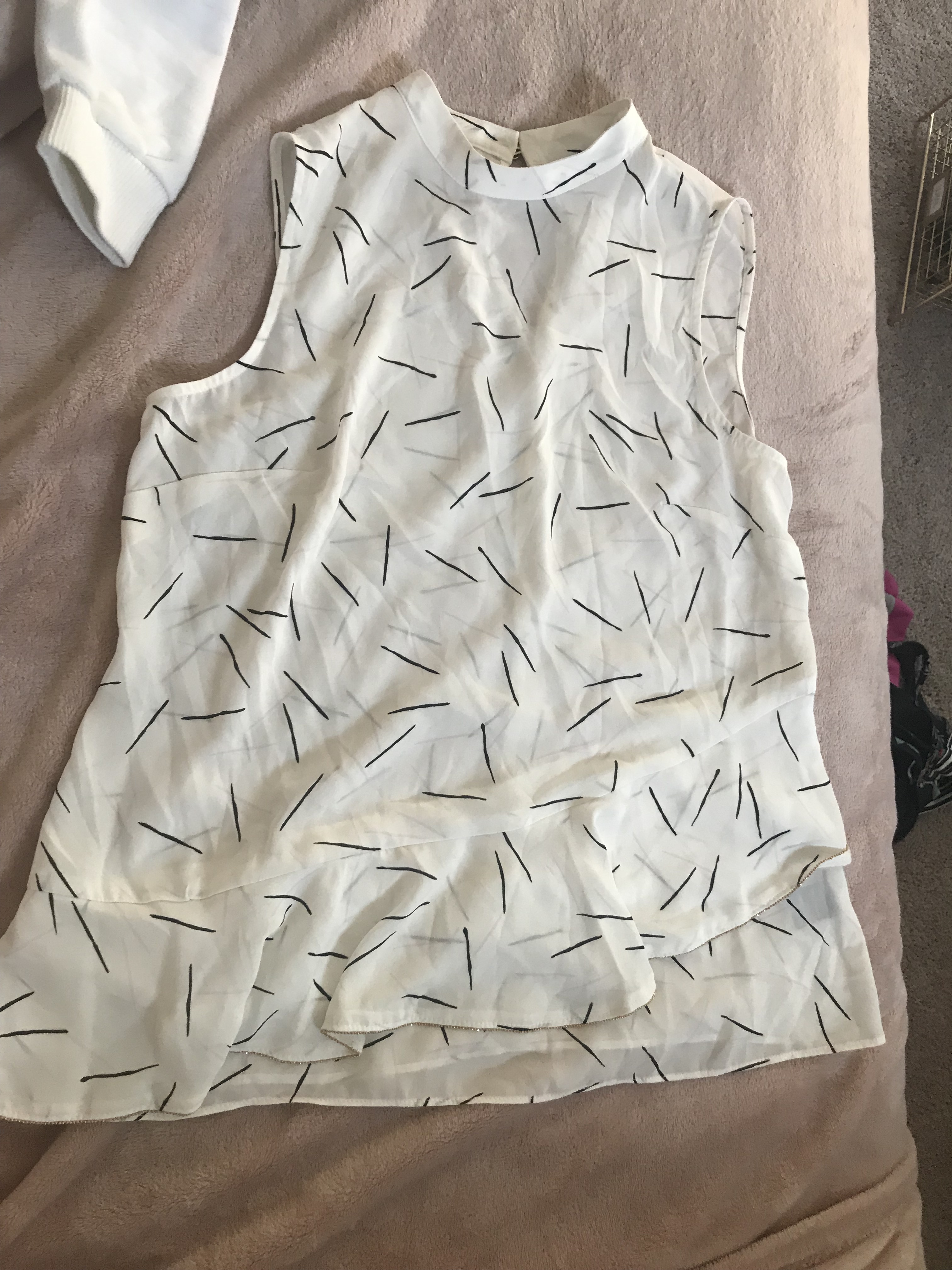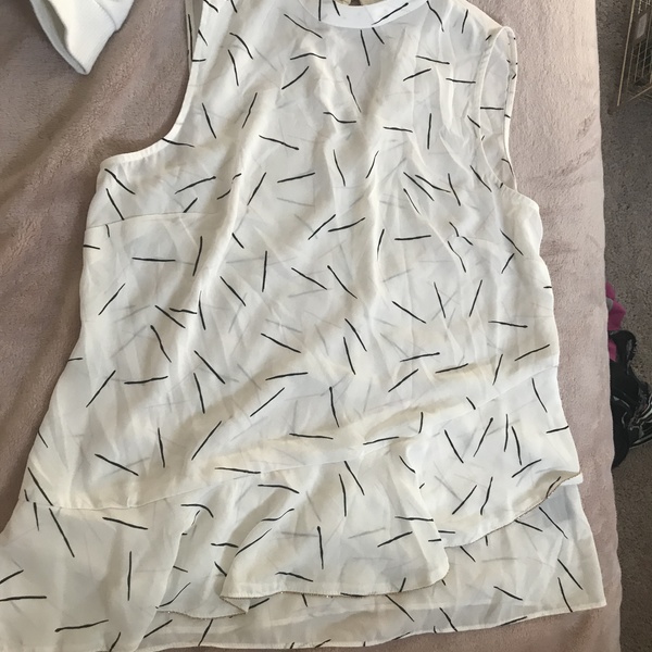 A bit sheer, white with black and pink pattern. high neck with asymmetrical ruffle trim. Brand: APT.9