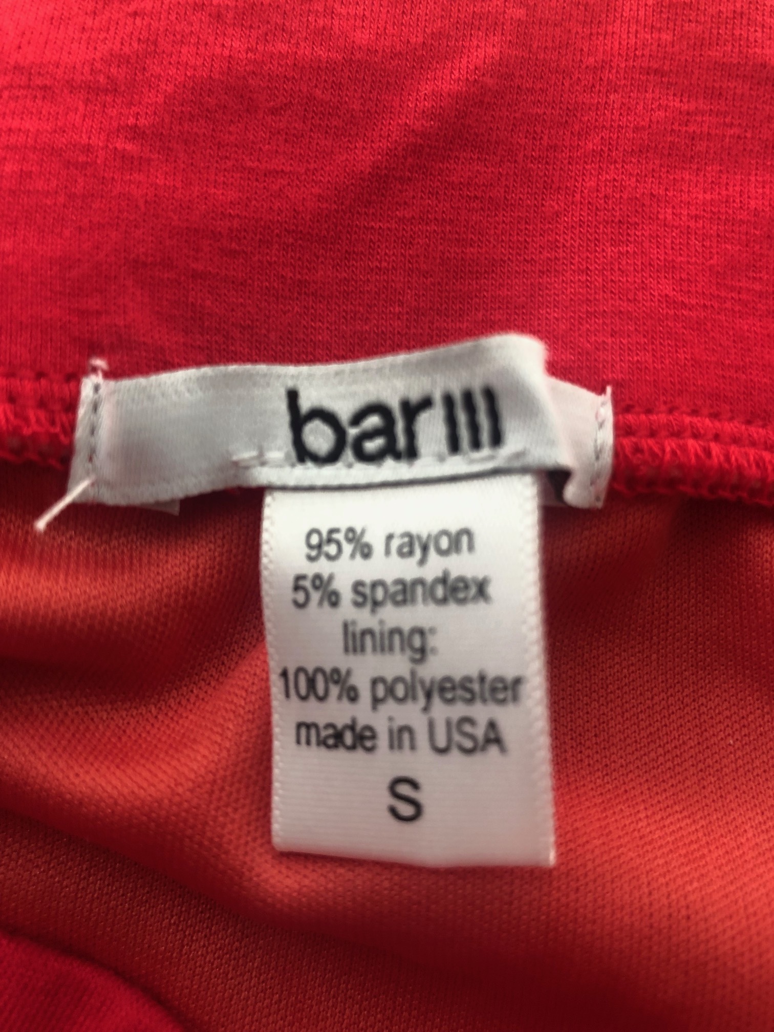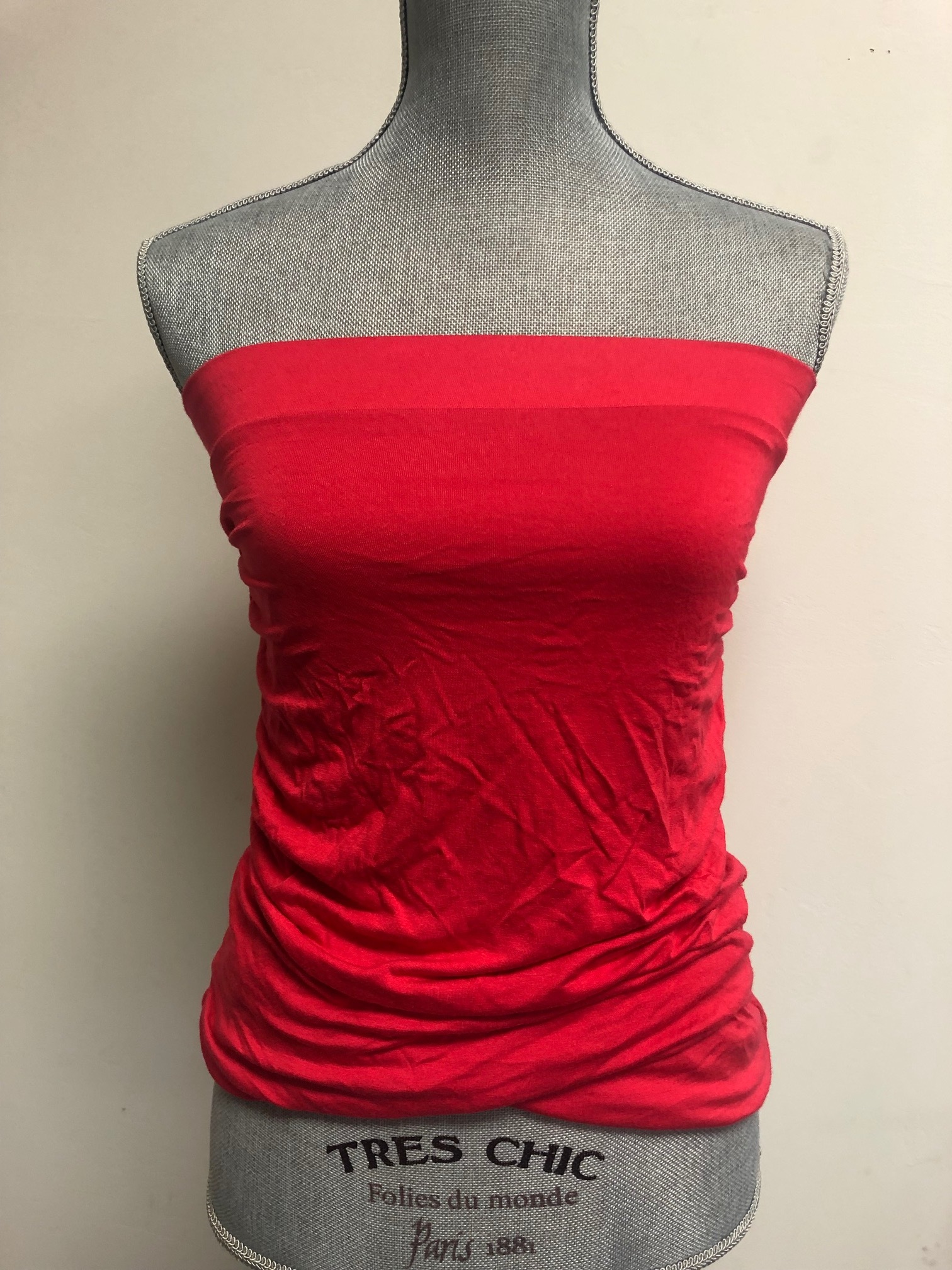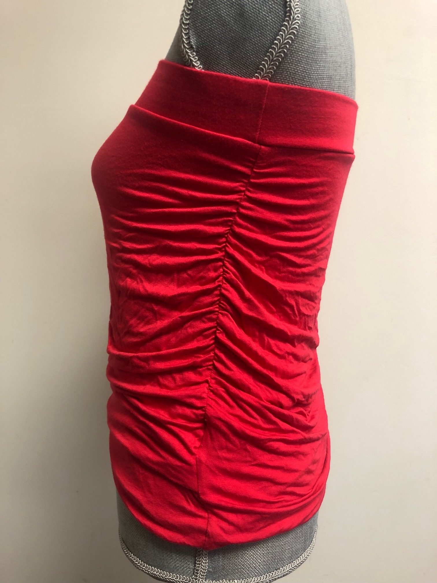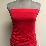 Nice color reddish pink tube top in great shape since I never wore it. Size Small. Has ruching on the sides and tapered bottom. Apologize for the wrinkles. It has been in storage.
