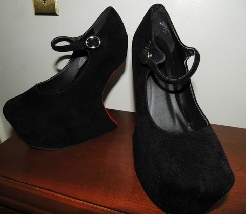 Black heel less wedges with red backs. No defects. Gorgeous and unique! They will come in the original box. Never really worn, just tried on around the house once. Black Velvet Heel Less Mary Jane Curved Wedge, Size 7. This is the one thing I will be really picky about. I will only trade something awesome for these.
