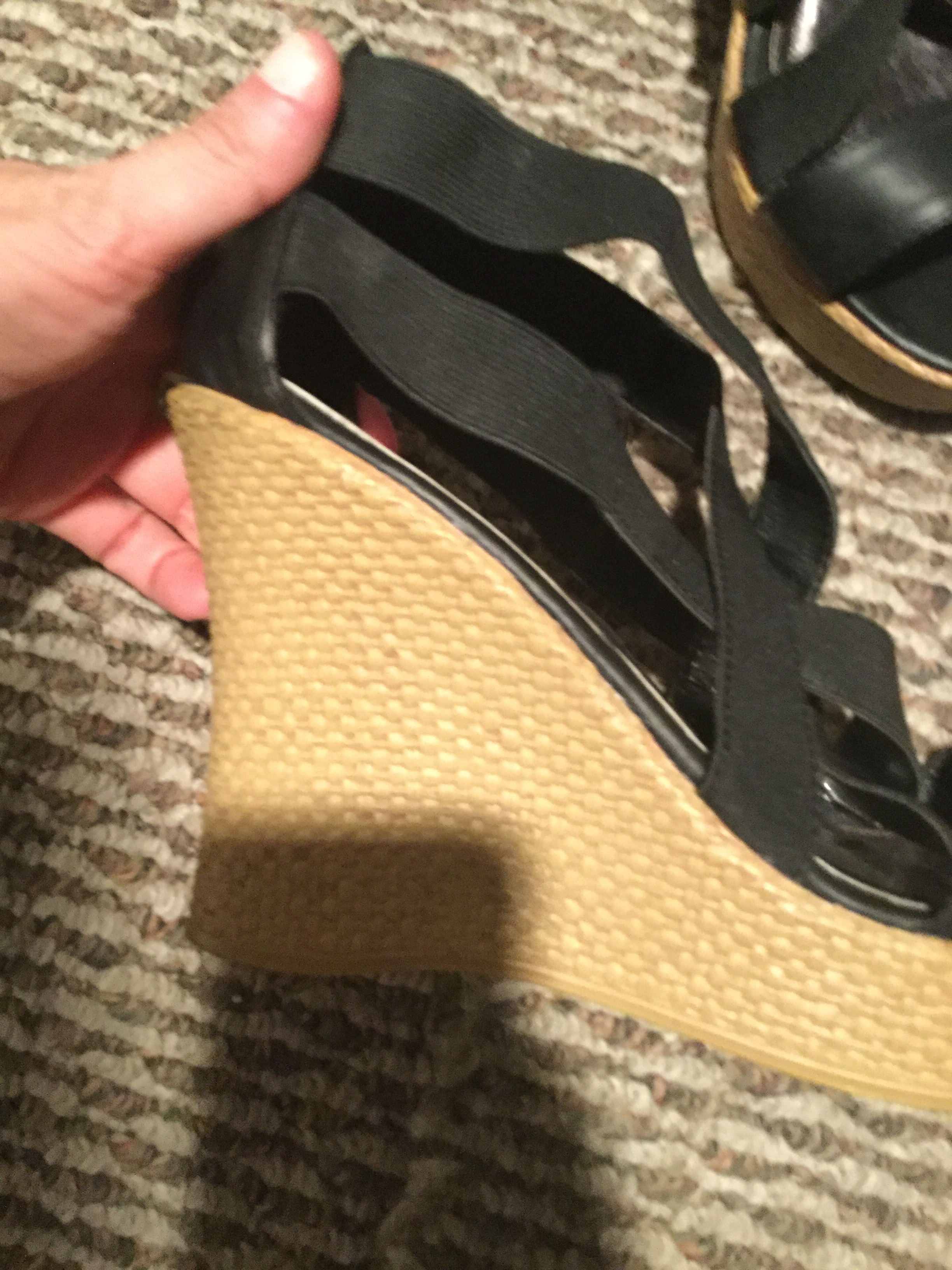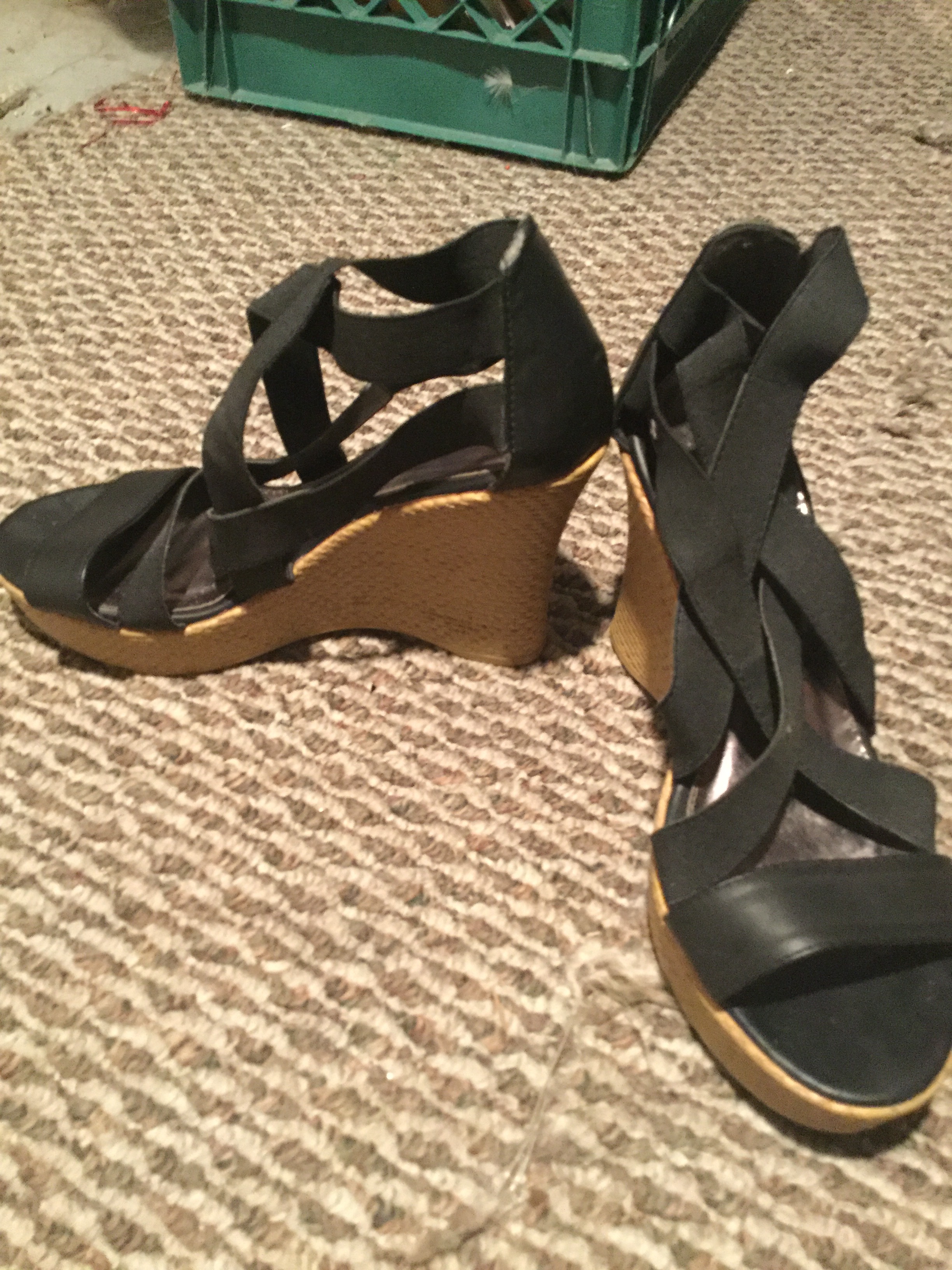 Black faux-suede wedges, 5" heel, round toe. Worn once outside on dry asphalt, extremely clean inside and out. Fit TTS, pretty comfortable all things considered.