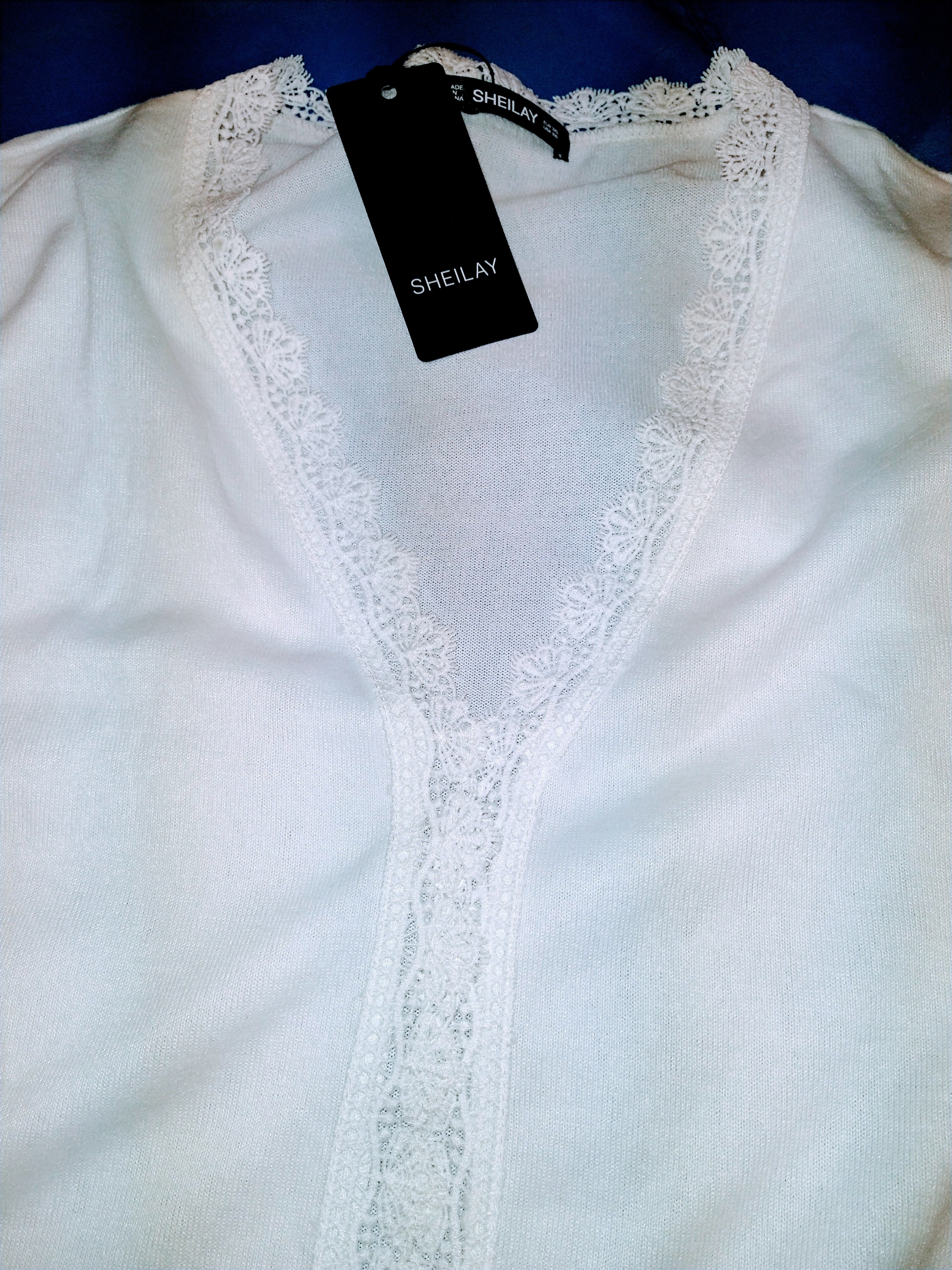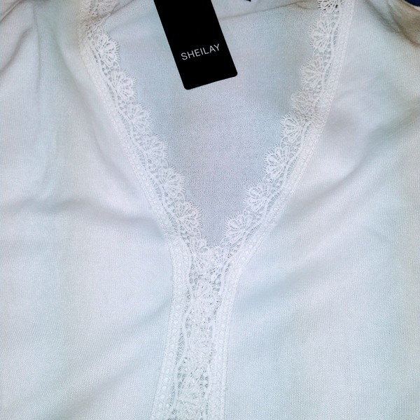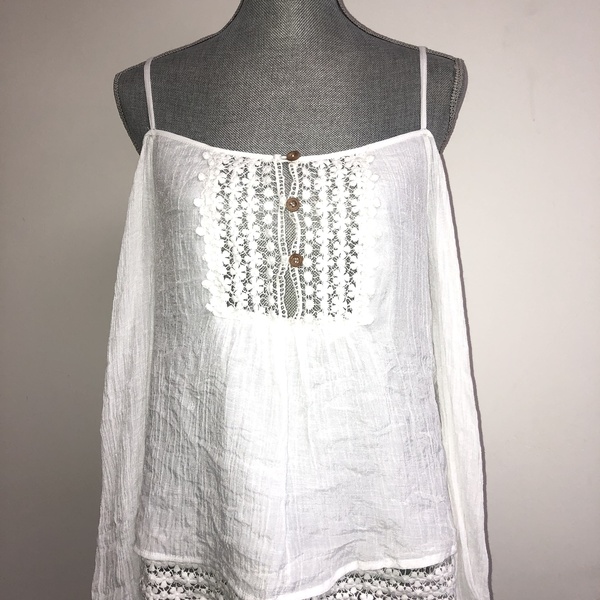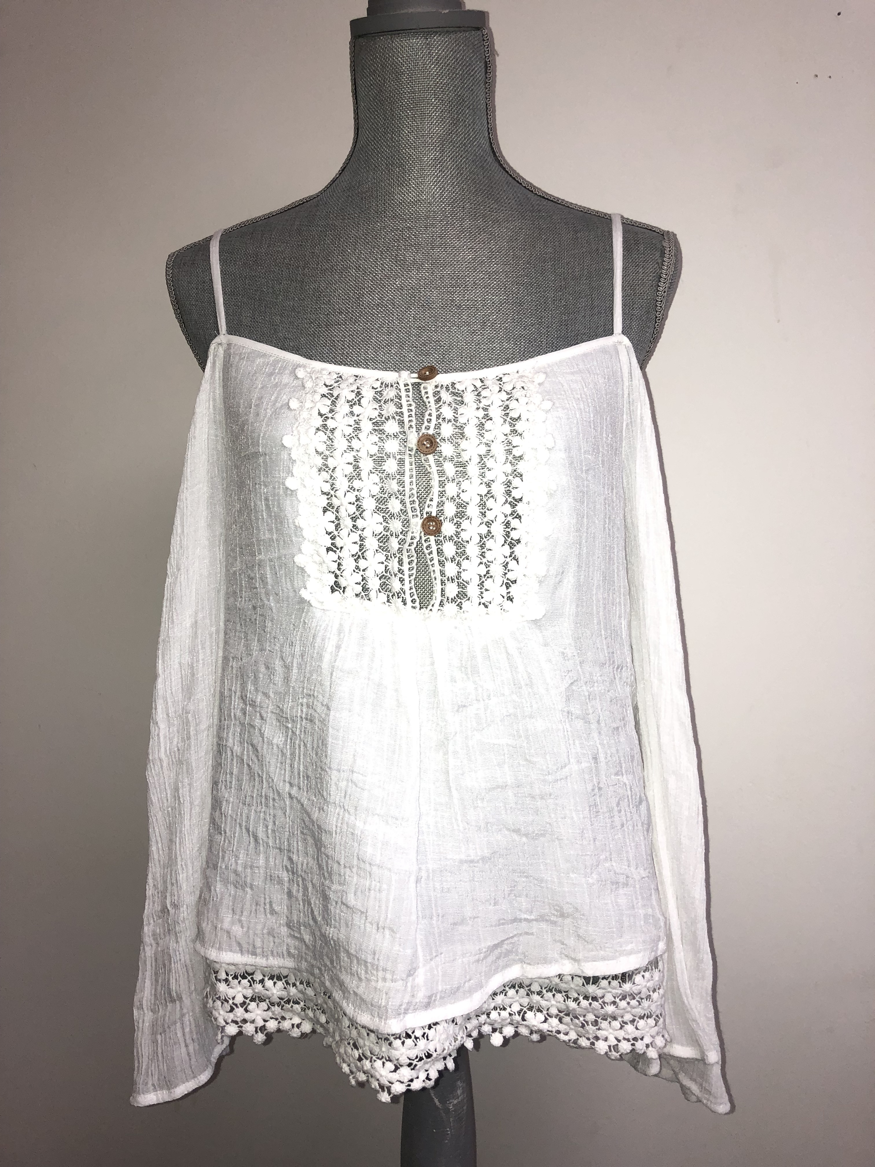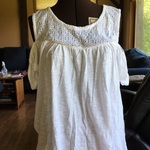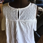 White off the shoulder top with lace front and wooden buttons. Lined. Very cute!