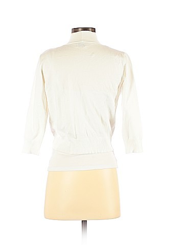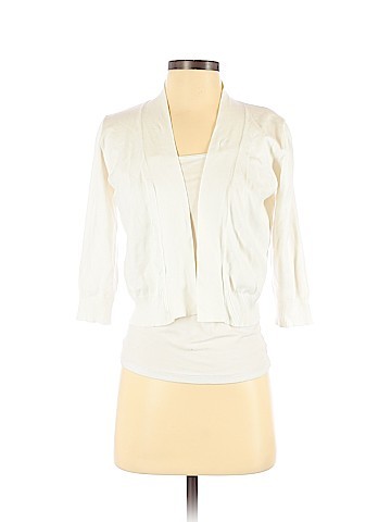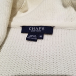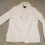 White 100% cotton Chaps cardigan. Cowl neckline, 2 pockets, 5 large white buttons.