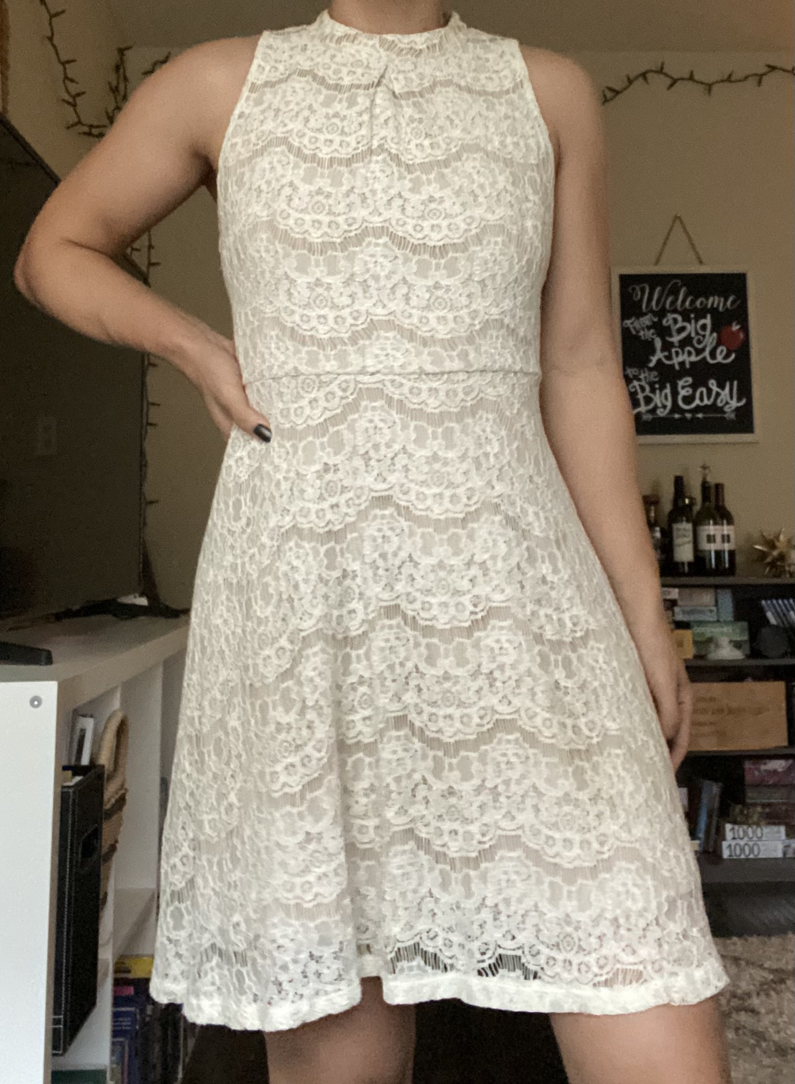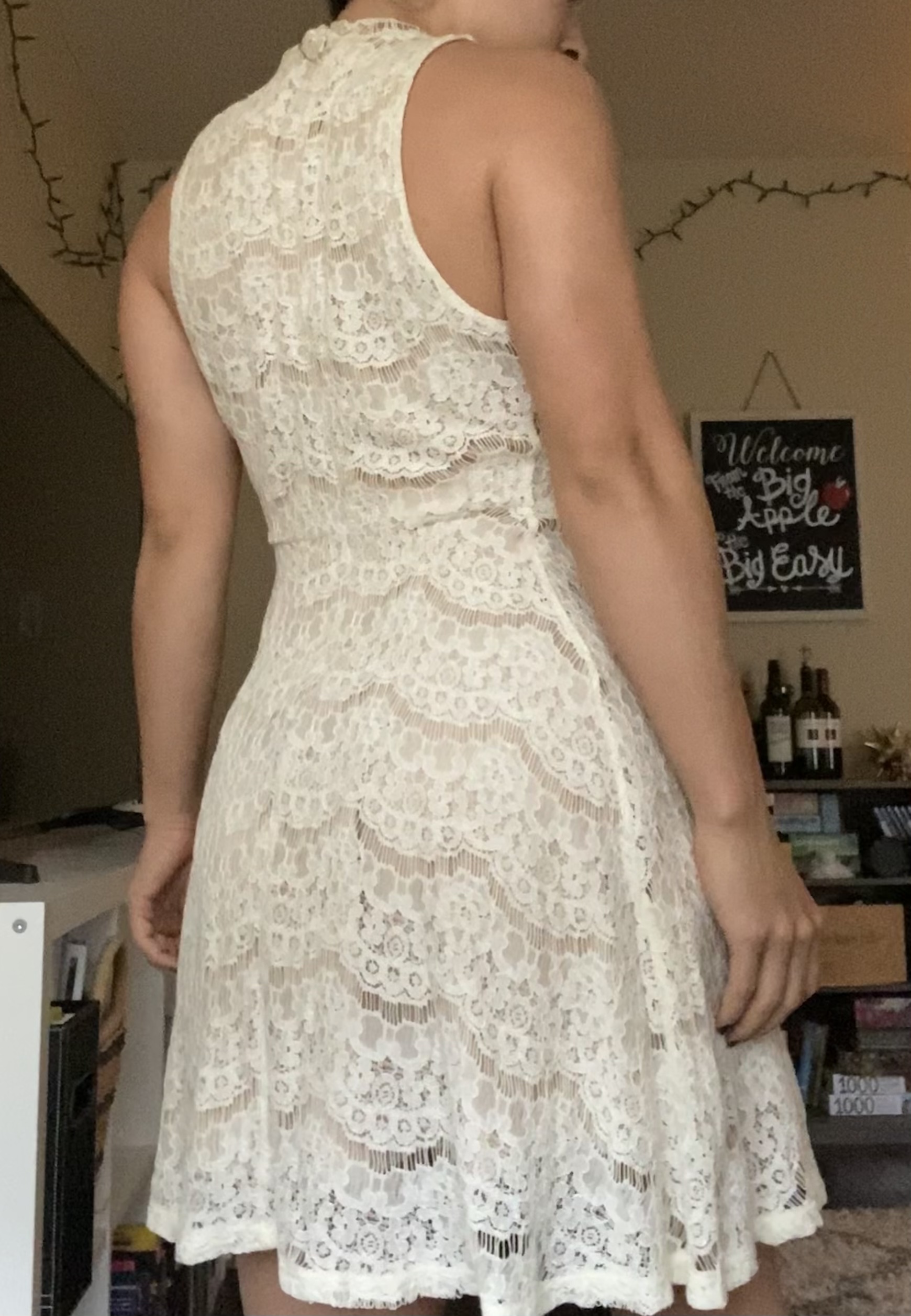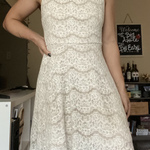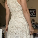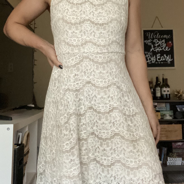 A very unique white dress from Forever with beads around the neckline. Features a layer of solid white fabric with another layer of lacy transparent white fabric on top. I'm a size small, and it fits well on me.