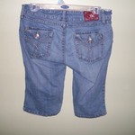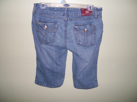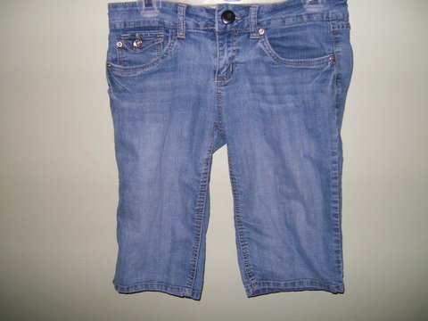 These have been worn but they are in good condition. The original metal jean button popped off so I have sewn on a replacement black button. Won't even notice the different when you wear them. They are capris and YMI brand. Size 9