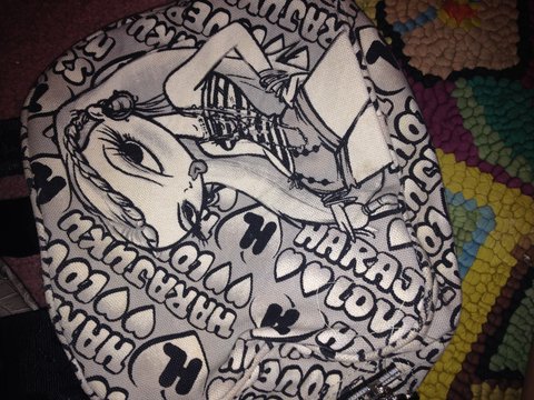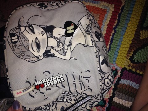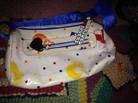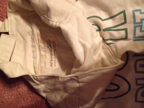 Cute bag with small zipper inside. Has a couple spots but should come off when cleaned
