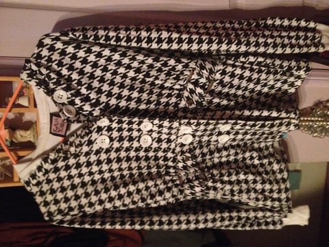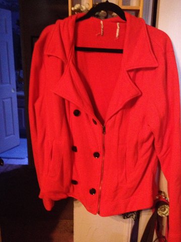 Peacoat style. Orangish red color. Never worn but was washed because I tried to shrink it, but it didn't shrink. Very cute