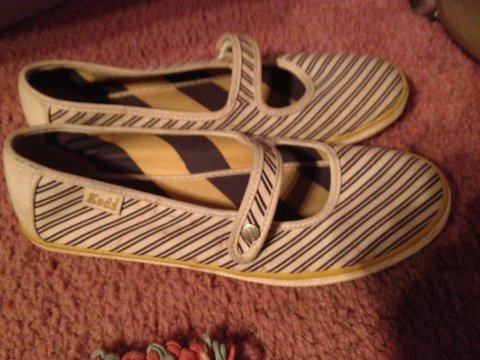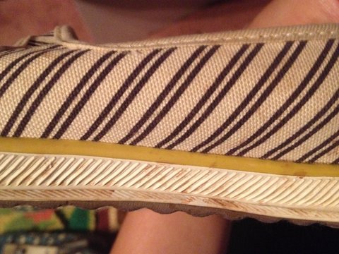 No tips or holes. A bit dirty on inside and some scuffs on on white part around canvas but could be cleaned with soap and water I'm sure. I still consider them in great condition and they are very cute