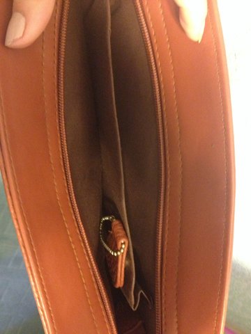 Small purse with no holes or rips. There are scratches on the buckle [photo 2] and a couple little spots inside that can easily be clean. Overall in great condition